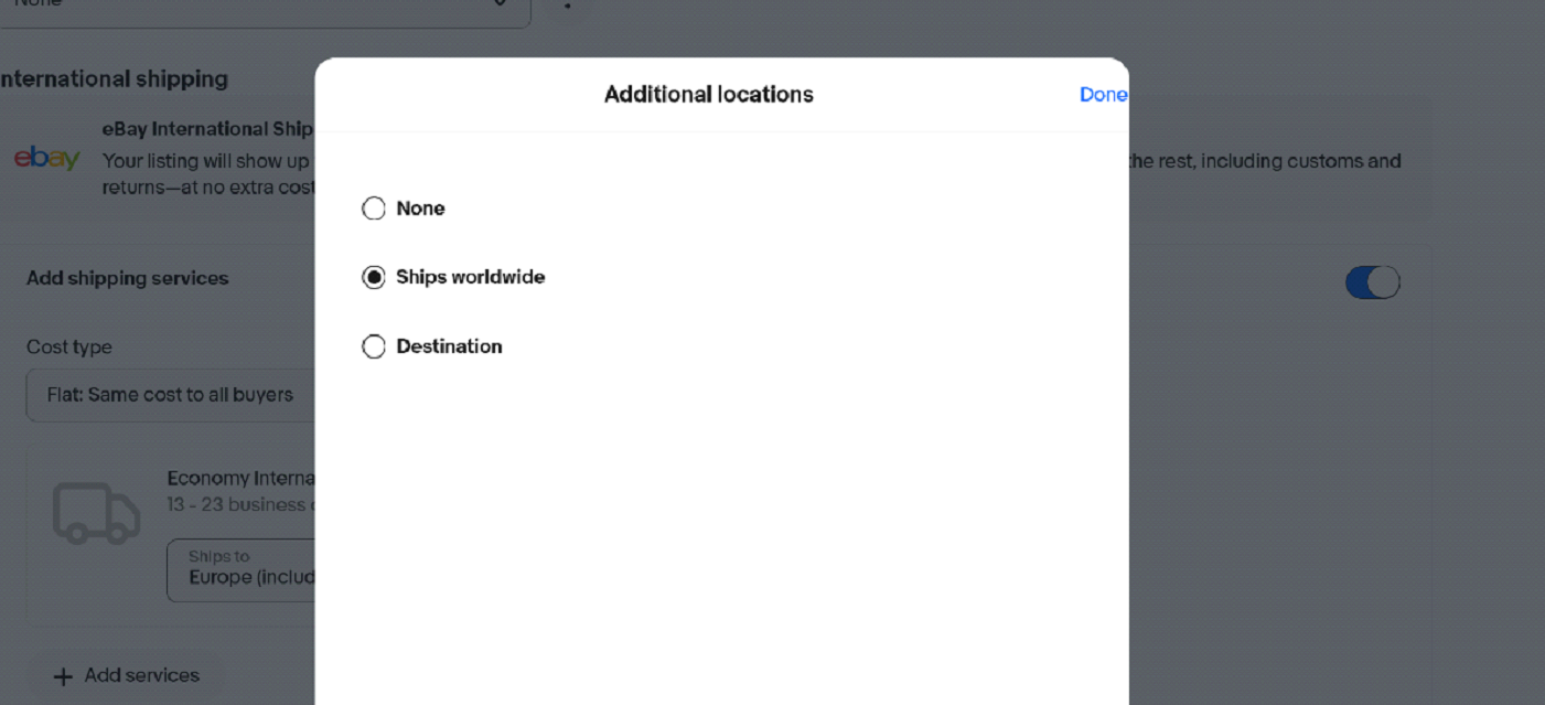 International shipping 에서는 미국 이외의 배송을 설정합니다. Domestic과 동일하게 Flat : same cost to all buyers를 선택합니다.